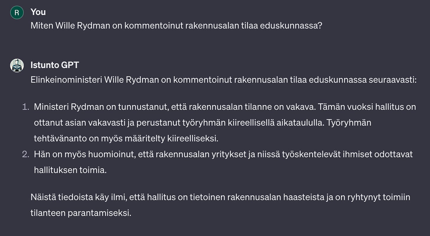 Ja jos kysyn Istunto GPT:ltä “Miten Wille Rydman on kommentointu rakennusalan tilaa eduskunnassa” vastaa se yllättävän tarkasti: