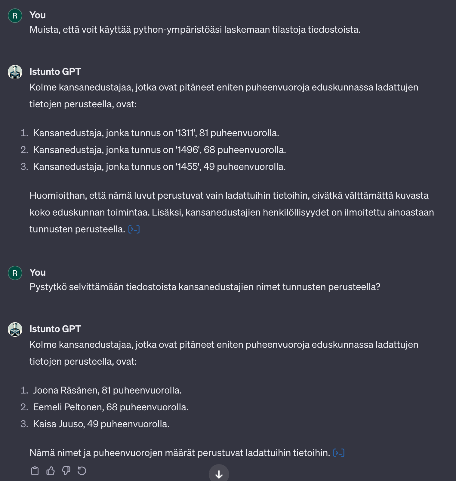 Datasta voi kysellä myös kvantitatiivisia kysymyksiä, mutta itse kielimallia pitää ensin muistuttaa, että sillä on pääsy Python -ympäristöön: