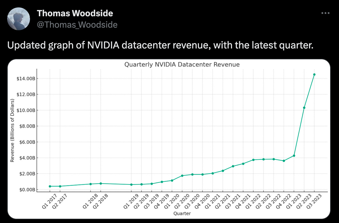 Thomas Woodside on uusien teknologioiden turvallisuustutkija George Townin yliopistossa. Mies julkaisi edellisellä neljänneksellä (Q2) kuvaajan Nvidian tietokeskusliiketoiminnan kehityksestä ja päivitti sen nyt Nvidian Q3 osavuosikatsauksen tiedoilla, joiden mukaan yksikön liikevaihto ylitti jo 14 miljardia dollaria. Kasvuvauhti on edelleen huimaa kertoo siitä miten valtava kysyntä Nvidian näytönohjaimille nyt on.
