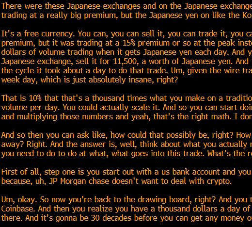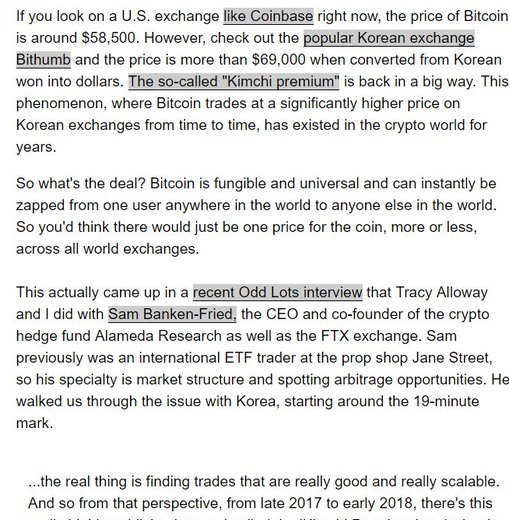 Bloombergin Joe Weisenthal julkaisi eilen kaksi mielenkiintoista twiittiä liittyen Bitcoinin hintavaihteluihin Aasian markkinoilla. Ensimmäisessä twiitissä Joe käy läpi ns. Kimchi-preemiota, missä Bitcoinin hinta korealaisilla valuuttakauppapaikoilla saattaa olla ~$10000 korkeampi kuin mitä se on Coinbasessa: