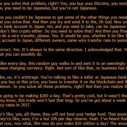 Toinen Joen twiitti käsitteli sitä miten yksi cryptorahaston perustaja onnistui löytämään arbitaasi mahdollisuuksia Japanin Yenin ja Bitcoinin hinnan avulla, mikä johti $20 miljoonan päivittäisiin voittoihin: