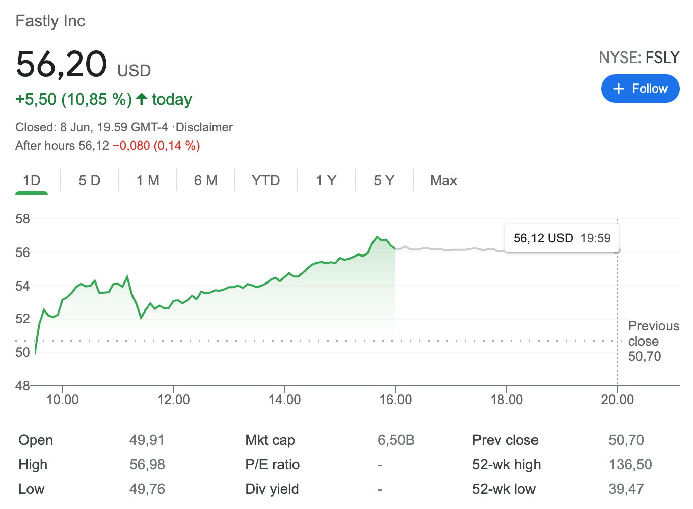 Hieman ehkä yllättäen, markkinat näyttivät lähinnä olevan vaikuttuneita siitä, miten nopeasti Fastly sai vian korjattua, joten yhtiön osake olikin melkein 11 % nousussa kaupankäynnin loppuessa New Yorkissa.
