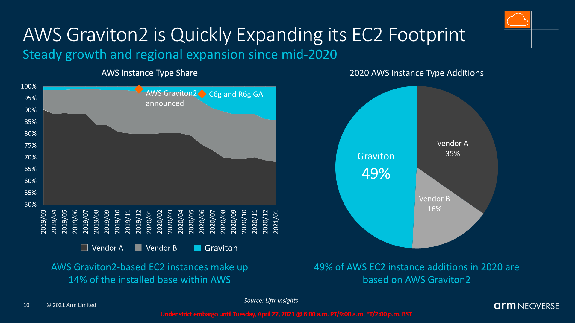 Graviton2-prosessorit pyörittävät nyt 14 % AWS:n EC2 instansseista ja n. puolet uusista EC2 instansseista vuonna 2020 olivat Graviton2 pohjaisia. Tuo on huimaa kasvua ja tulee pitkälti x86 (Intelin ja AMD:n) kustannuksella.