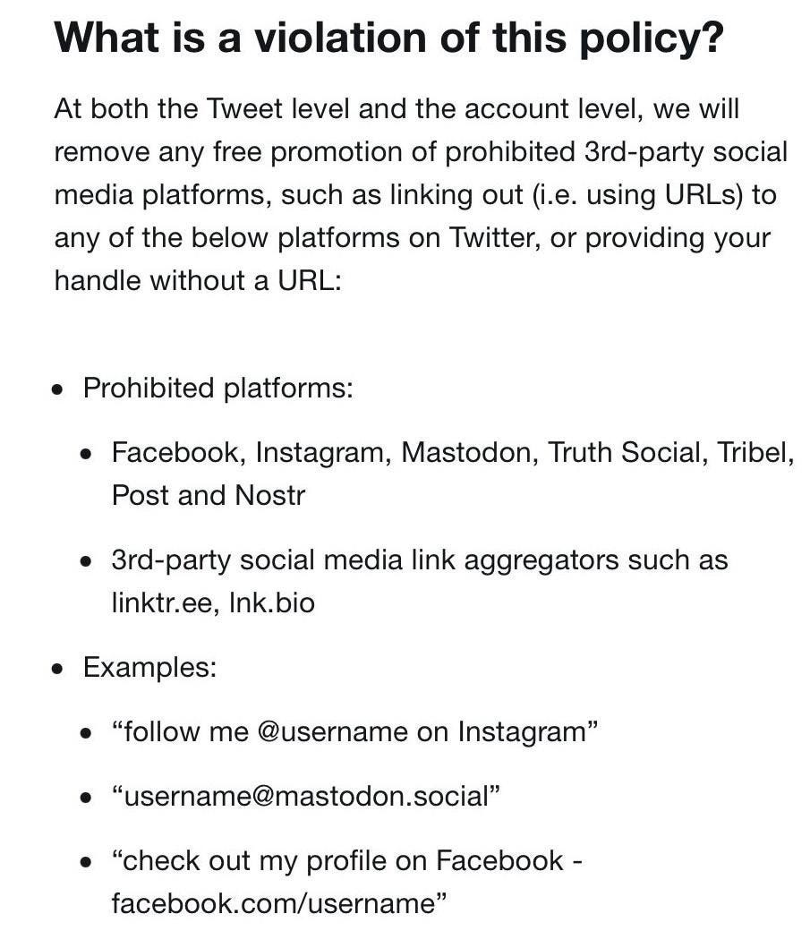 Twitterin käyttäjäehtoja muutettiin eilen hetkellisesti niin, että tiettyihin muihin sosiaalisiin medioihin linkittäminen kielletään. Näihin kuului mm. Facebook, Instagram ja Mastodon. Yhtiö tosin päätyi kiertämään päätöksensä, mutta todella moni tehokäyttäjä totesi siirtyvänsä Mastodoniin ennen tätä. Ohessa kuvankaappaus suunnitellusta käytännöstä.