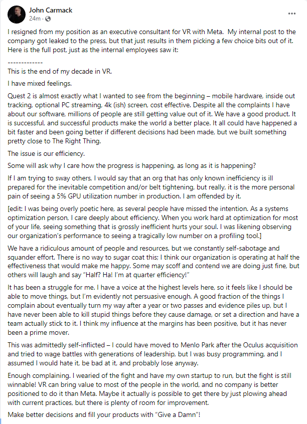 Carmack julkaisi erostaan kertovan Facebook-kirjoituksen, missä hän totesi mm. että on tyytymätön siihen miten paljon Metalla “tuhlataan vaivannäköä”. Alle kuvankaappaus koko kirjoituksesta:
