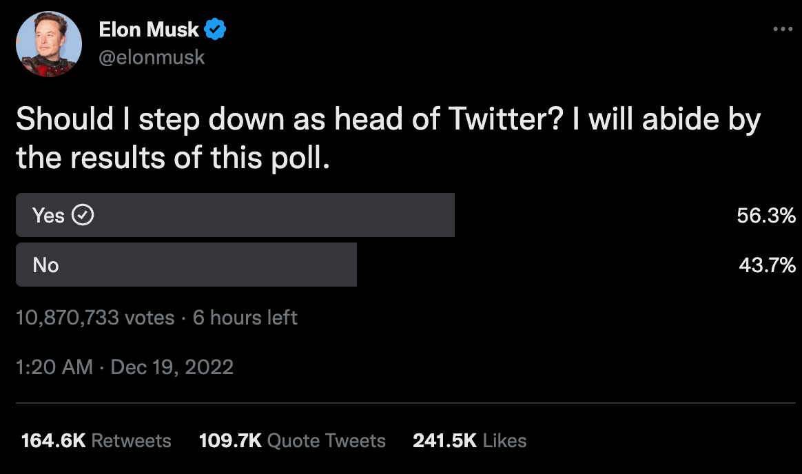 Päätöksen kiertämisen jälkeen Musk pystytti uuden kyselyn, jossa hän haluaa käyttäjien äänestävän pitäisikö hänen jättää pesti Twitterin toimitusjohtajana. Tätä kirjoittaessa “Kyllä” äänet johtavat n. 13 %:lla