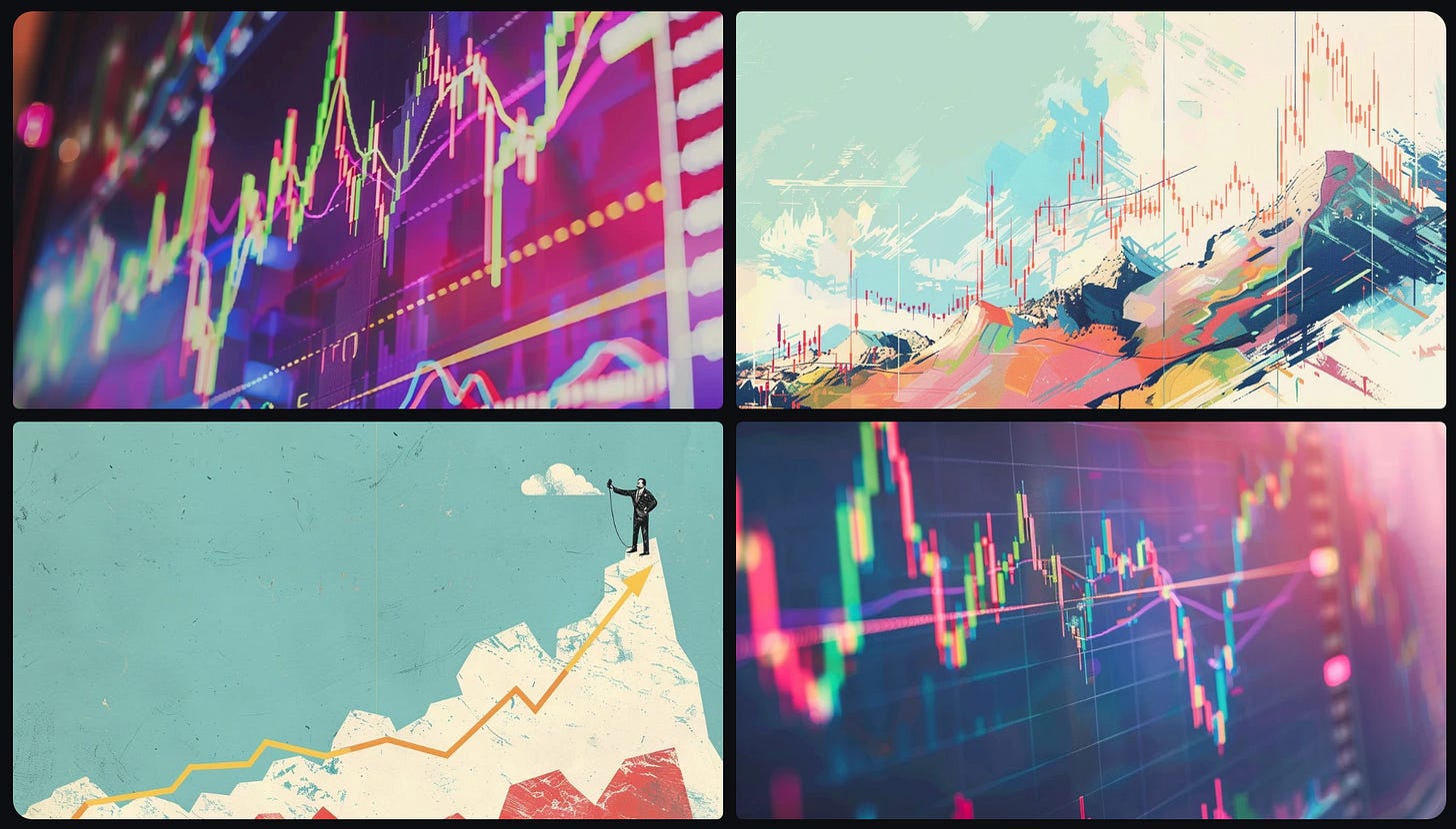 syötteen loppuun, personoi malli generoimansa kuvat käyttäjälle tämän aikaisemmin generoimien kuvien perusteella. Kun aikaisemmin aamulla koitin luoda syötteellä “stock charts going up” kansikuvia tämän päivän transistoriin sain suhteellisen tylsiä vaihtoehtoja: