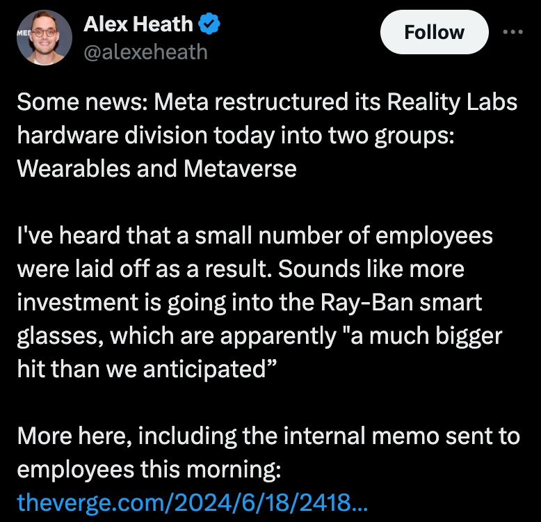 Muutoksen takana on ilmeisesti se, että yhtiön älylasiyhteistyö aurinko- ja silmälasivalmistaja Ray-Banin kanssa on ollut odotettua suurempi menestys. Asiasta raportoi The Vergen Alex Heath (maksullisessa) uutiskirjeessään: