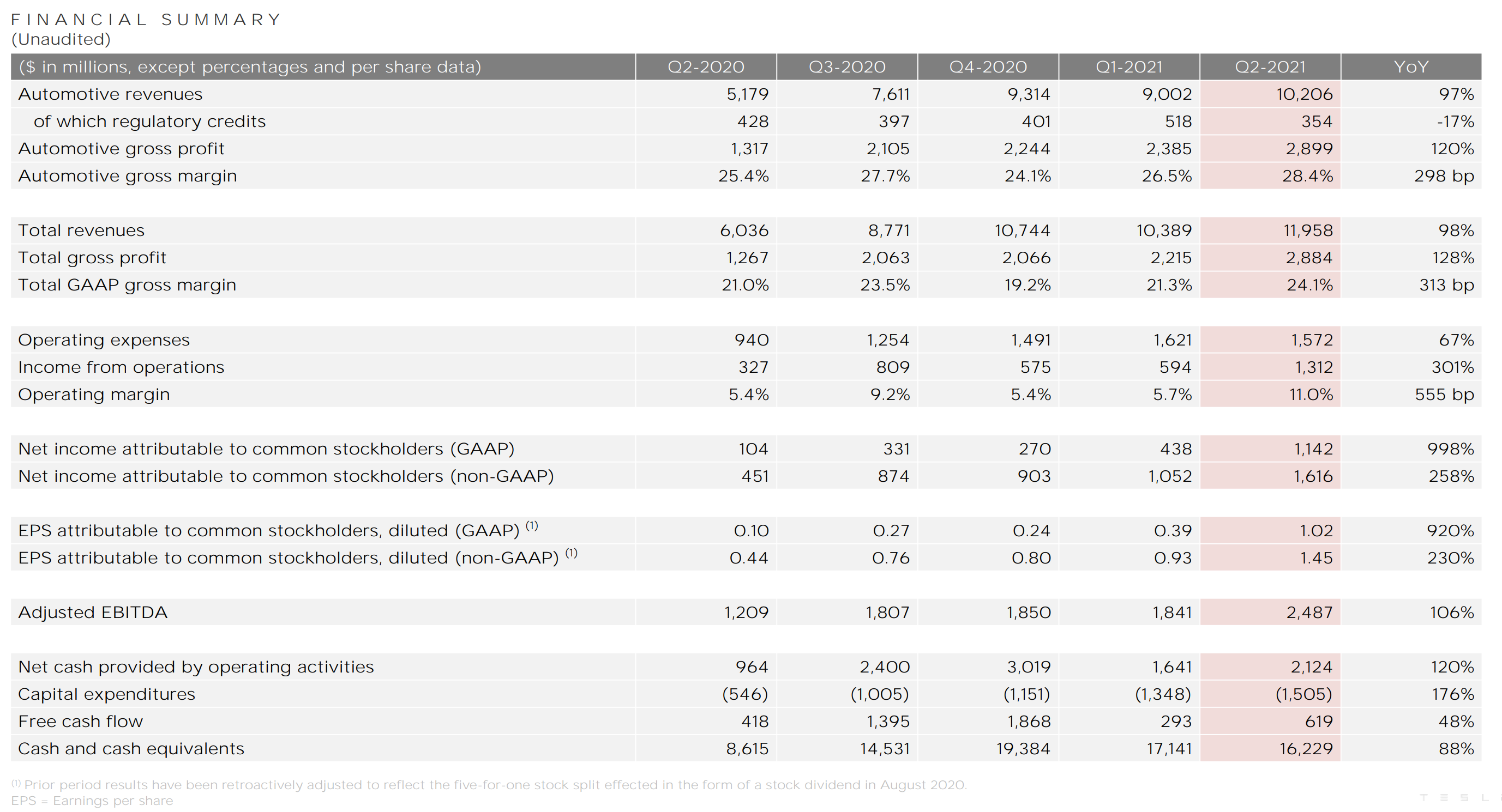 Autovalmistaja Teslalla oli viime yönä toisen neljänneksen tulosjulkistus. Yhtiön liikevaihto oli 11,958 miljardia dollaria ja se kasvoi 98 % vuoden takaisesta. Yhtiön GAAP-standardin mukainen liikevoitto oli 1,142 miljardia dollaria ja se kasvoi peräti 998 % vuoden takaisesta. Liikevoitto per osake (non-GAAP) taas oli 1,45 dollaria per osake. CNBC:n mukaan Wall Street odotti Teslalta 0,98 dollaria liikevoittoa per osake ja liikevaihtoa 11,300 miljardin dollarin edestä, joten Tesla löi odotukset. Yhtiön osake olikin n. 6,5 % nousussa jälkikaupankäynnissä.
